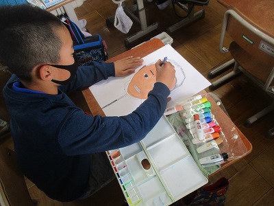 自分の顔をよく見て描きました。下描きは油性ペン1本のみ,間違えられないからこそじっくりと観察して描くことになります。着色すると,それぞれよく似た顔になりました。
