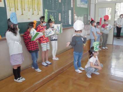 2枚目の写真は,国語科「ふきのとう」の参観日の学習です。お忙しい中,参観・懇談にお越しいただき,ありがとうございました。子どもたちがきんちょうしながらもがんばって音読したり役になりきってふりつけしたりする姿を見ていただけたかと思います。保護者の方からも,音読の感想を伝えていただきありがとうございました。グループで協力して,練習し始めたころよりもとっても上手になりました。