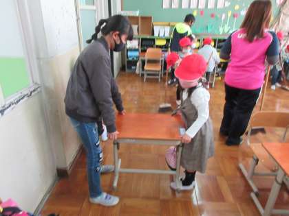 さすが6年生で,テキパキと机を運んだり,ほうきでゴミを集めたりしていました。1年生はそれを見たり,一緒に机を運んでもらったりして掃除の進め方を学びました。