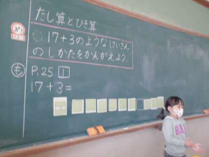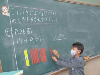 「たしざんとひきざん」の学習では,17+3のような,答えが何十になるたしざんや38+3のようなくり上がりのあるたしざんを学習します。どのような考え方で答えを求めたのか,数え棒を動かしながら友達に説明しました。何十のまとまりをつくることがコツです。コツをつかんで,計算がはやくなるといいですね。