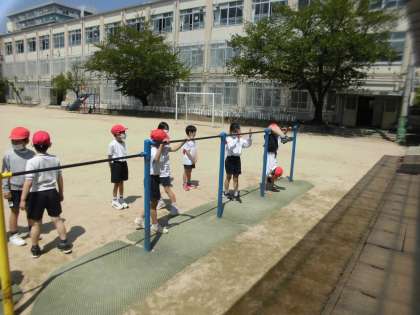 鉄棒の学習では,自分のできる技で少しずつ高い鉄棒に挑戦したり,できなかった技に挑戦したりしています。「まえまわりおりができた!」「前よりうまくなった。」「〇回連続でできた!」とうれしそうに話していました。挑戦する気持ちがステキですね!