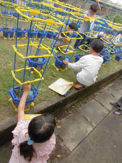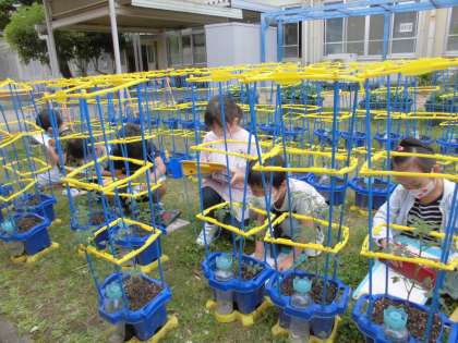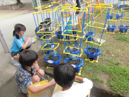 ミニトマトを植えたり観察したりしました。1年生のときのあさがおは,たねからですが,ミニトマトは,苗から植えました。茎がおれないように気を付けてていねいに扱いました。これからたくさんお世話をして,おいしいトマトができますように。