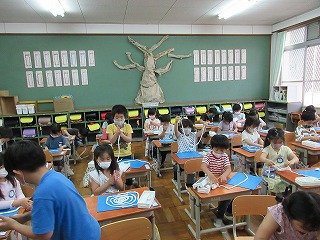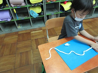 図画工作の時間に粘土を使いました。誰が一番長く伸ばせるのか競争してみたり,伸ばした粘土でいろいろなかたちを作ったりしました。長く伸ばすのは難しく,手のひらや指を使って工夫しながら伸ばしていました。みんな,素敵なかたちがたくさんできていました。
