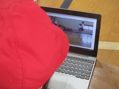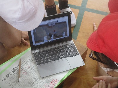 試技をしている様子をタブレットで撮影しました。映像を見ながらアドバイスをし,新たな試技にむかいました。