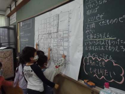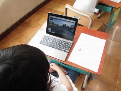 七三地域のお気に入りの場所やお気に入りの人を伝え合ったり,GIGA端末のグーグルストリートビュー機能を使って町探検をしたりしました。「ぼくは,花屋町交番のおまわりさんが好き。優しくて親切だから。」「ドミノピザの店員さんがやさしい。おいしいピザを作ってくれている。」などとそれぞれお気に入りがあるようです。