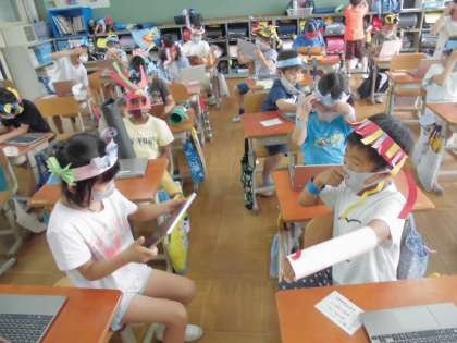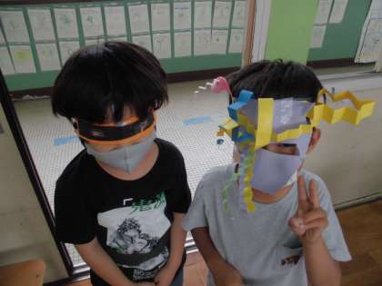 わっかでいろいろな飾りをつけて,大変身しました。わっかをかぶってお互いに見せ合い,「いいね。」「ここがすごい!」と伝えていました。どんな姿に変身したのかまたおうちに持ち帰ったら見てくださいね。