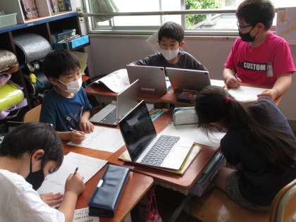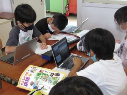 社会科では,京都市の様子について学習を進めています。今週は,工場が多いところ・山にかこまれたところ・田や畑が広がっているところ・住たくが多いところの中から,自分が選んだ場所について調べる活動をしました。京都市の絵地図を使って自分たちの校区から見てどの方向にあるかを確かめ,自分たちの校区と様子がどう違うかを,タブレットを使って調べました。