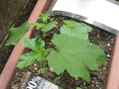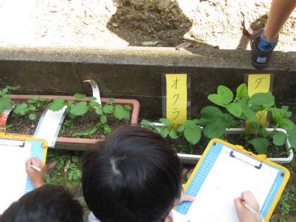 5月に種をまいたダイズやホウセンカ,ヒマワリにオクラが,日に日に大きくなってきています。どの植物も,子葉の間から,子葉とは形の異なる本葉が顔をのぞかせ,葉っぱの数を増やしています。昨日,理科の時間に植物の様子を観察しました。本葉の数を数えたり茎の高さを定規で調べたりする子もいました。