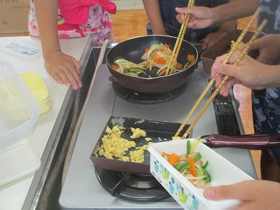 いろどりいため(野菜炒め)とスクランブルエッグの調理に取り組みました。