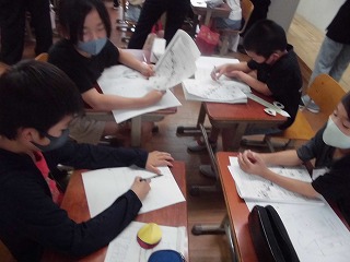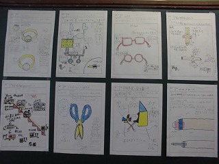 ハナヤ学習「みんながくらしやすいまち」の時間に,班でユニバーサルデザインを考えています。他のグループと交流して,お互いにいいところを伝え合ってデザインを練り上げています。