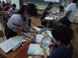 ハナヤ学習「みんながくらしやすいまち」の時間に,班でユニバーサルデザインを考えています。2・3組の授業の後,1組では付箋紙を使って,他のグループと交流しました。だれかの困りを解決するために考えたアイデアが,他の障害をもっている方にも役に立つものであることや,ここをこうすればもっとよくなるというアドバイスを伝え合いました。今後は,もらったアドバイスを元に自分たちのグループのデザインを練り上げていきます。