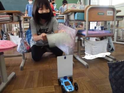 今回は,車に帆のようなものを立て,風を起こして車を進ませました。