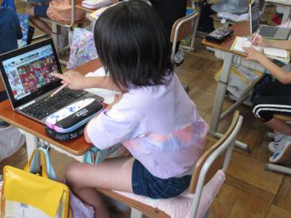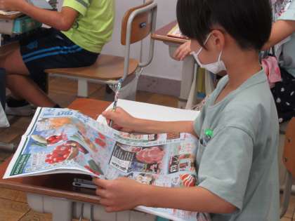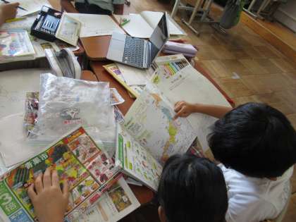 家からスーパーマーケットのチラシや野菜の袋・肉のパックなどについているラベルを持ってきて調べたり,GIGA端末で送信したチラシを使って調べたりしました。調べたことを地図に書き込む活動をしたのですが,「北海道から運ばれている野菜や果物がたくさんあるよ。」「日本だけでなく,外国から運ばれているのもがあることを初めて知った。」「ほかのスーパーマーケットではどうなのか,もっと調べてみたいな。」など,たくさんの感想をもったようです。