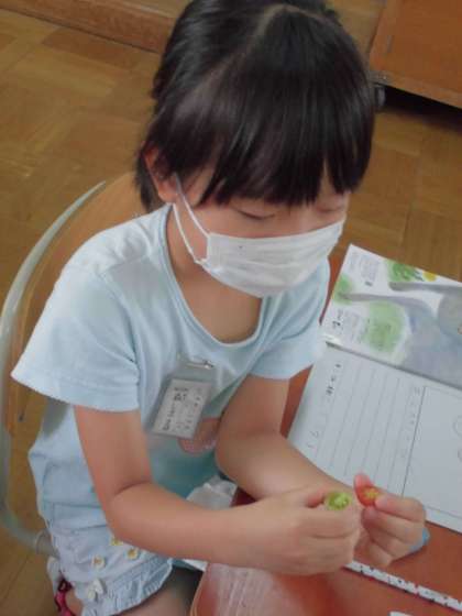 緑のトマトと赤のトマトの中を見てみました。たねの様子や実のやわらかさなどたくさんちがうところが見つかったようです。「赤いトマトは食べるときに中を見るけど,緑のトマトはこんなかんじなんだ!」「まだかたいなあ。」「赤は中がとろとろだけど,緑はとろとろがない。」「なんで赤いトマトは,たねが黄色なの?」とたくさん気づきや疑問があったようです。