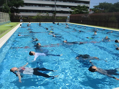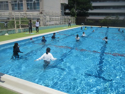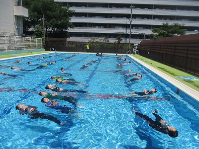 川や海で事故に合ったら,どうすればよいか。服を着てプールに入り,動きにくさや泳ぎにくさを体感しました。無理に泳いで助けを求めようとするのではなく,ペットボトルのような浮くものにつかまったり,大の字になって浮いて待ったり,エレメンタリーストロークでゆっくりと移動したり,とにかく落ち着いて動くことが大切だと学びました。自分の命は自分で守る,そのための大切な学習でした。