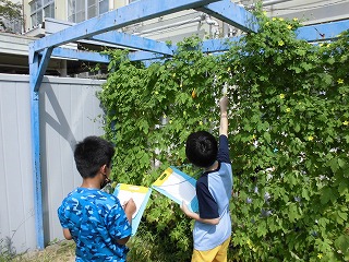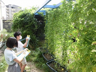 夏休みが終わり,1学期から育てているツルレイシがどのようになったかを観察しました。「実がオレンジ色になってる!」や「ここは少し枯れてる。」というように夏休み前の大きな実ができていた時期から変化している様子を観察することができました。また,たくさん花が咲いている中から雌花を見つけることができ,雌花と雄花の違いについても観察することができました。夏の終わりまで大切に育てて,ツルレイシを観察していきます。