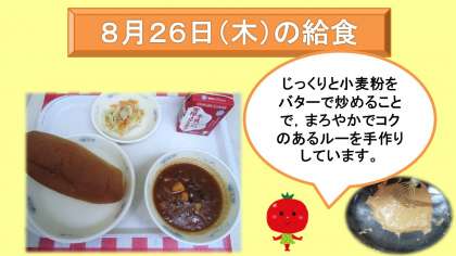 8月26日(木)から,2学期の給食がスタートしました。献立は,味付けコッペパン・牛乳・トマトシチュー・ツナとキャベツのソテーでした。感染症対策で,少し寂しいですが,静かに前を向いて食べることを各クラスお願いしています。どのクラスも静かに,心で味わいながら食べていました。食べている途中には,感想を聞けないのですが,給食時間が終わった後に,給食室まで「おいしかったよ。パンにシチューがとってもよく合っていたよ。」と感想を伝えてくれました。夏休み明けの暑い日でしたが,残菜も少なくしっかりと食べてくれていて,うれしかったです。