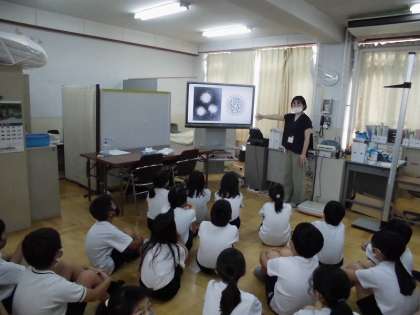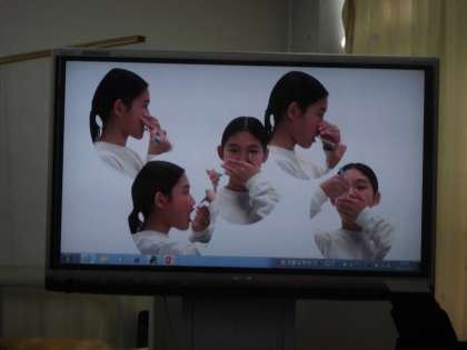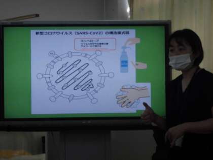 今日の身体計測の時に,養護教諭から新型コロナウイルス予防と新しい生活様式での歯磨きについてのお話を聞きました。アルコールで消毒することでコロナウイルスを予防することができるのは,アルコールはコロナウイルスの膜にあるエンベロープというものをこわすからウイルスをやっつけられることや,マスクにはウイルスを含む飛沫の大きさより細かい網があるので,マスクをすることで感染の予防になるなどの「なぜ消毒・手洗い・マスクをするのか」ということについてくわしく教えてもらいました。また,ビデオで飛沫を飛ばさないために,「歯ブラシを持たない方の手で口を覆いながら磨く」という新しい歯の磨き方も知りました。子どもたちは,興味津々で話に聞き入っていました。