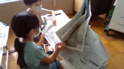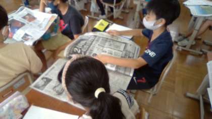 国語科の学習では,新聞からどのように情報を得れば良いかを考える学習をしています。今日は,実際に新聞を読み,それぞれの面にどのようなことが書かれているか調べました。