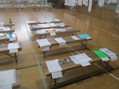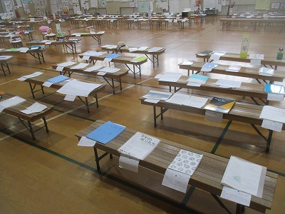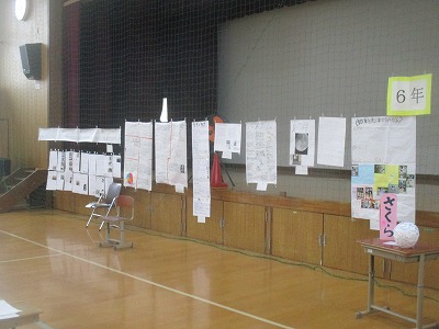 6学年の作品がずらっと並べられた体育館で,鑑賞をしました。ほかの学年の作品にもじっくり目を通し,「1年生からこれだけ取り組んで,すごいなあ!」と声を漏らす人もいました。6年生の力作にも,他の学年から「すごい」という声がたくさ挙がっていますよ!頑張りが輝いています。