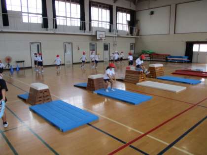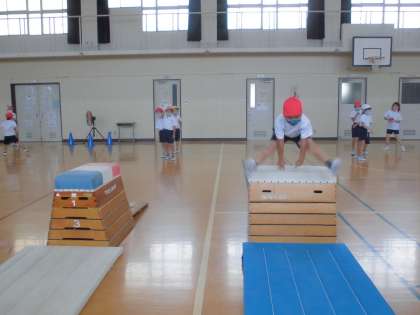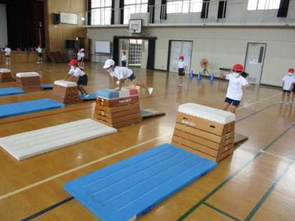 体育科では,とびばこの学習をしています。開きゃくとび以外にもいろいろな跳び方に挑戦しています。準備や片づけも上手にできました!