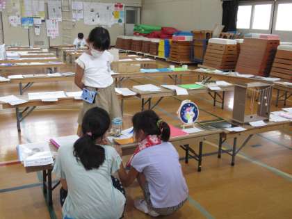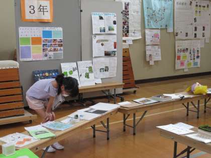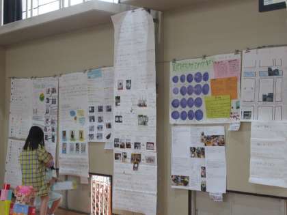 今日は,体育館に展示されている全校児童の自由研究作品を鑑賞しました。自分の作品をあらためて見たり,学年の友だちや他学年の友だちの作品を熱心に鑑賞したりしていました。「この工作は,とてもおもしろい仕組みになっているよ。」「自分と同じテーマで研究している友だちがいたけれど,まとめ方が違っていておもしろかった。」など,いろいろな感想をつぶやいていました。来年チャレンジしてみたい研究テーマが思い浮かんだ子もたくさんいたようです。