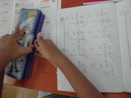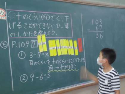 たし算とひき算の学習では,前に習ったことを使って,位が多くなってもくり上がりやくり下がりをしてひっ算ができました。十の位が0で,くり下がりができないものも,図や友達の説明で,理解して解くことができました。いろいろなパターンを習ったので,何度もくり返し練習して,間違えずに解けるようにしていきたいですね。