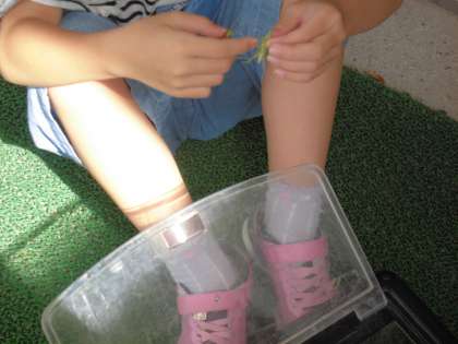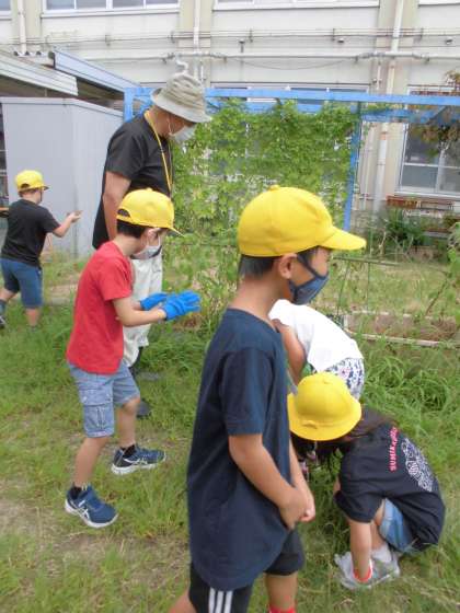生活科では,虫を見つけて育てています。虫が住みやすいおうちになるように,土や草などを準備しました。「かくれ場所を作ってあげよう。」「はっぱは小さく切って入れてあげたらよいかな。」と工夫していました。観察してみると,「この大きいバッタと小さいバッタは結婚しているかも。」「親子ちゃう?」と想像をふくらませていました。