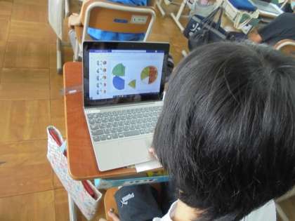 算数科では,分数の学習に入りました。二分の一の大きさを作るには,三分の一や四分の一,六分の一をどのように組み合わせればよいかを考えました。四分の一を2つ組み合わせたり,六分の一を3つ組み合わせたりすれば,二分の一と同じ大きさになることを知りました。GIGA端末を使って,実際に図形を動かして考えている人もいました。