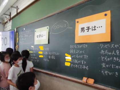 こころの日の学習で,「女子」や「男子」といった性別でひとまとめにしたものの見方について考えました。