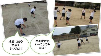生活科の学習では,みんなで水遊びをしました。水を遠くまでとばしたり,えをかいたり,かけあいっこしたり・・・。とっても楽しそうに遊んでいました!ペットボトルの用意,ありがとうございました!