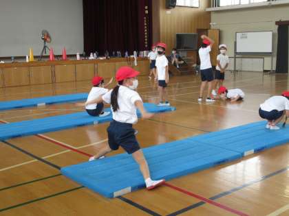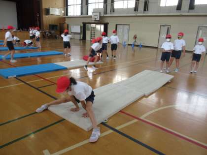回を重ねるたびに,マットの準備から準備運動をすませるまでが,とてもはやくできるようになりました。友だちにアドバイスをもらったり,タブレットで動画を見てコツを確認したりしながらがんばっています。