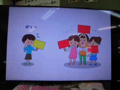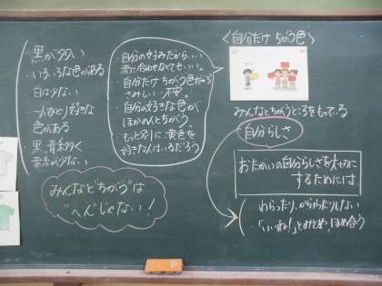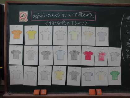 9月のこころの日の学習は,はじめに自分の好きな色のTシャツを黒板に貼ることからスタートし,お互いの「自分らしさ」を大切にすることについて考えました。みんなと違うところこそが「自分らしさ」であり,「みんなと"ちがう"は"へん"じゃない」ということを学習しました。子どもたちは,これからの生活においてお互いのちがいを笑ったり,からかったりせずに「いいね」と認め,ほめ合うことが大切であると考えていました。