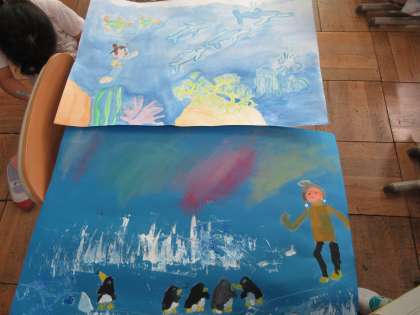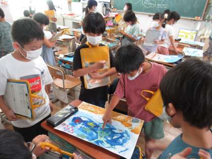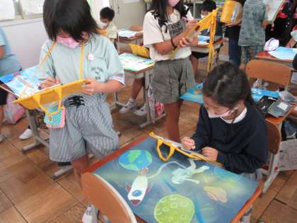 絵本のストーリーからイメージをふくらませ,「もし自分がこの世界に入ったら…。」「絵本の作者は,こんなことを伝えたかったのかな。」など,いろいろなことを考えながら,感じたことを絵で表現しました。みんなが選んだ場面はさまざまで,一人一人のよさがあらわれたすてきな作品になりました。お互いの絵を鑑賞しながら,いいなと思ったところなど感想を伝え合う姿もすてきでした。