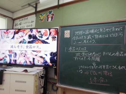 今週は,地球温暖化防止のために「食品ロス問題」「プラスチック問題」について考えました。年間600万トンもの食品ロスがあることを知り,それを減らすためにコンビニやスーパーなどでは手前から商品を取ることや必要な分だけ買うことが大切であるということを学習しました。プラスチック問題では,リサイクルされているプラスチックは全体のわずか9%であること,プラスチックが生き物の生態系を乱してしまっていることなどを知り,ペットボトルなどは分別することやマイバッグを持ち歩いてレジ袋を使わないようにすること,シャンプーなどの詰め替えといった繰り返し使うことができるものを使うことが大切であるということを学習しました。