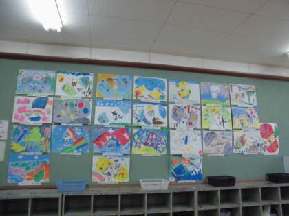 教室では,夏休み前に描いた「ふしぎなたまご」の作品を飾っています。