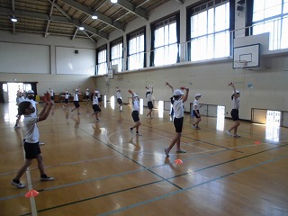 体育科では,「民よう 鳴子おどり」を学習しています。今週は初めて鳴子を使って踊りました。初めて鳴子を使って踊ったので,これまでより少し踊りにくかったという子もいましたが,鳴子のきれいな音によって踊りがこれまで以上に華やかになっていました。学習している鳴子おどりはスポーツ大会で行う予定です。