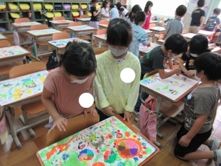 図画工作科「おはなしから うまれたよ」の学習で,友だちの作品を鑑賞し合いました。友だちの作品を見て,「○○さんの作品は,色が丁寧にぬれていてすごい!」「なんでここをこう描いたのか気になる!」と,素敵な所や気になったところをたくさん見つけて交流し合いました。