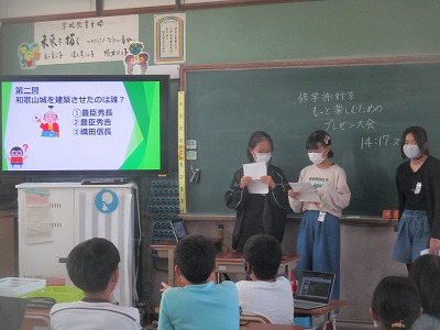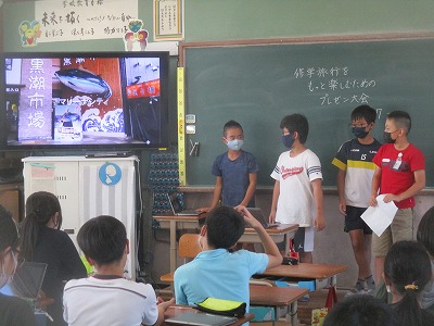 明日からの修学旅行に向けて,訪問するところを中心に調べたことをプレゼンしました。ためになる発表ばかりで,2日間の活動の意欲につながりました。今日はしっかり体を休めて,元気に来てください。