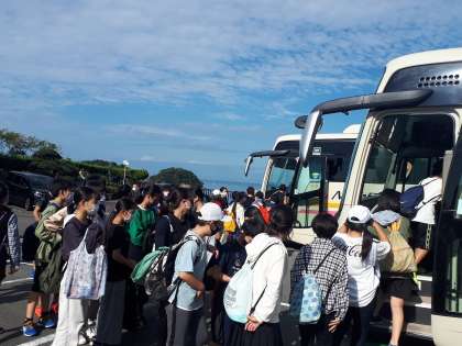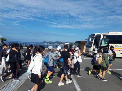 お世話になったスタッフの皆さんへ挨拶して、アドベンチャーワールドへ、全員元気に出発です。