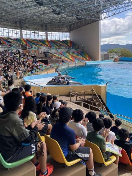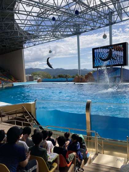 イルカショーは、イルカがジャンプしたり芸をしたりするたび「おぉー」と歓声が上がり、水飛沫がかかるぐらいの距離で、盛り上がっていまし