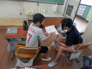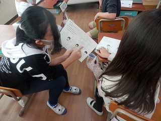 算数科の面積の学習では,いろいろな形の面積の求め方を考えています。子どもたちは視点を変えて何通りも方法を考えたり,自分の考えをまとめた後は図形や式を指さしながら友だちに説明したりして理解を深めていました。粘り強く取り組む姿勢がすばらしかったです。
