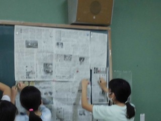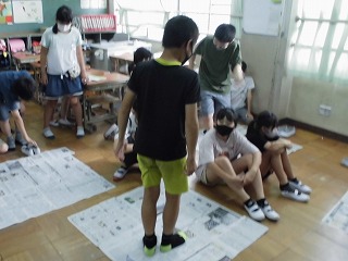 算数科「面積」の学習で,1平方メートルの大きさについて新聞紙を使って調べました。1平方メートルの大きさの新聞紙に乗ってみると「思っていたより広かった。」という意見がありました。また,1平方メートルの大きさの新聞紙を使って黒板や教室の窓,教室前の廊下などの大きさを調べました。調べていくうちに「家の広さはどれくらいなのだろう。」と疑問をもつ子もいました。