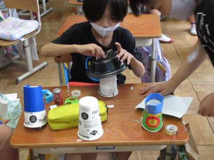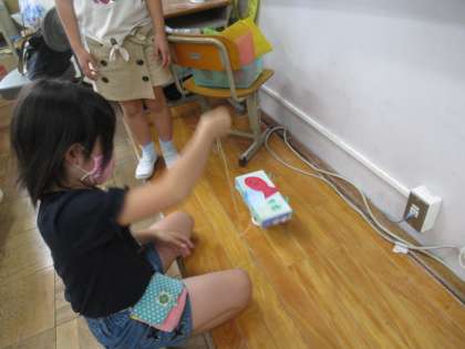 自分の作ったものがうまく動くと大喜び,笑みがこぼれていました。トレーや空き箱など,材料のご準備をありがとうございました。