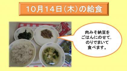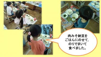 今日の給食は,牛乳・麦ごはん・肉みそ納豆・手巻のり・ほうれん草のおかか煮・すまし汁でした。教室でのりの上に,ごはんと肉みそ納豆をのせて巻いて食べました。1年生も上手に巻いて,楽しそうに食べていました。「納豆大好き!」の声や「納豆は苦手だけど,これは食べてみたら,おいしかった」とうれしい声もありました。肉みそ納豆は,納豆に牛肉・青ねぎ・たまねぎ・にんにく・しょうがを入れて,赤みそ・砂糖・料理酒・トウバンジャン・しょうゆ・酢で味をつけています。納豆は加熱しすぎると栄養価が落ちてしまうので,最後に加えてさっと炒めています。