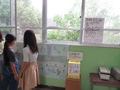 ハナヤ学習(総合的な学習の時間)では,地域の商店街の脳トレクイズイベントに使っていただくポストを作成しましたが,今週からは校内で,七条商店街(七条中央サービス会)のことをもっと知る・もっと知ってもらう目的で,「商店街クイズ」を始めています。月曜に3クラスで一斉に準備をして,火曜からスタートしました。