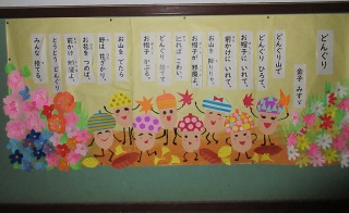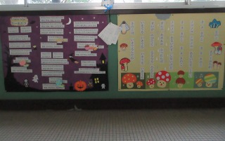 1年生の教室前の廊下を見てみると,とっても素敵な可愛い掲示がたくさんあります。校務支援員さんが,みんなのために作って飾ってくれています。「この歌知ってる!」とみんな,喜んでみていました。10月に入り,ハロウィンの歌も新たに加わっていました♪