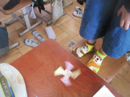教科書についているこまのようなものを組み立てて回すと・・・