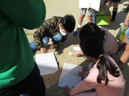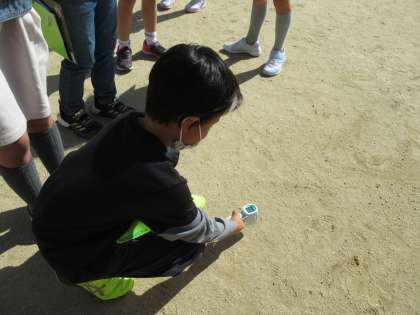 先週は,時間の経過とかげの位置・太陽の位置について調べましたが,今週は,日なたと日かげの地面のあたたかさの違いについて調べる学習をしています。今日は,温度計を使って,午前9時頃と12時頃の,日なたと日かげの地面の温度を調べました。