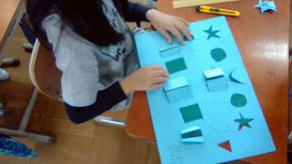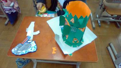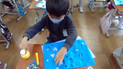 カッターナイフを使うのも少しずつ慣れてきました。画用紙を切って,まどを作っていきます。まどから何がのぞいているのかな?まどは,どんな模様にしようかな?自分の思いに合わせて,画用紙の立て方も工夫します。